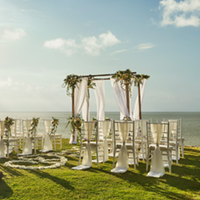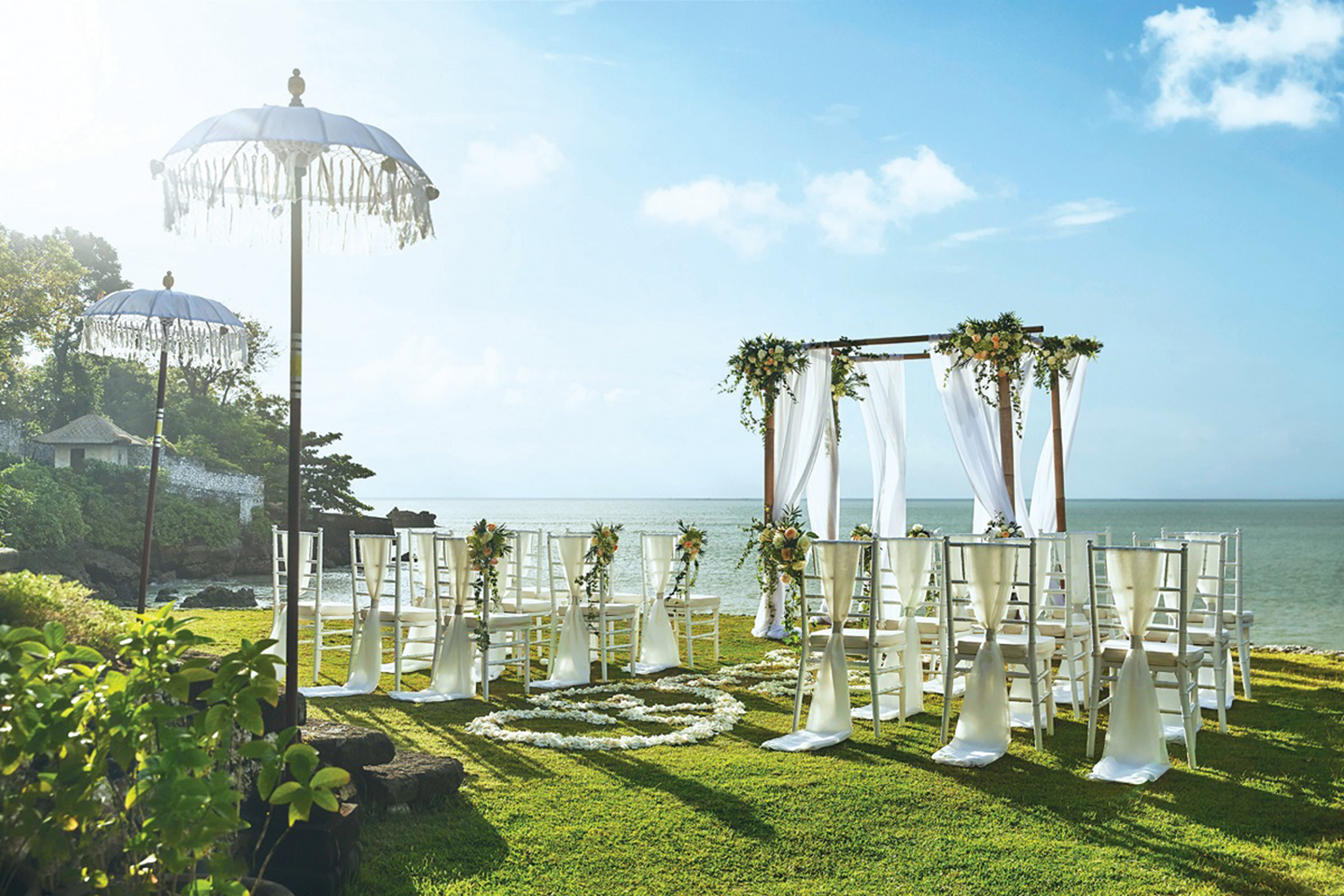 隱匿於峇里島金巴蘭灣四季度假村內,Gili Jimbaran以私人島嶼之姿獨享海天一線的蔚藍聖境。儀式場地鋪展於翠綠草坪,背景是無垠的印度洋與天空交融的湛藍畫布,純白紗幔隨海風輕揚,與沿途綻放的熱帶白花共舞,以至純白色的列席座椅,讓婚禮成為一場私密島嶼上,隨潮汐節奏永續迴盪的純白詩篇。