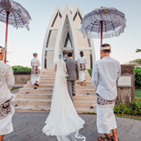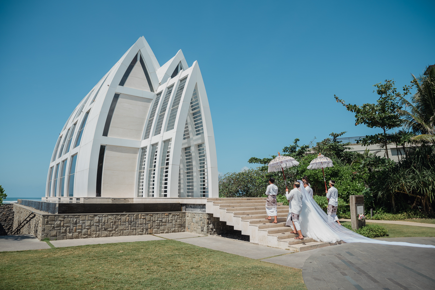 The Majestic Chapel坐落於努沙杜瓦區的峇里The Ritz-Carlton酒店內。獨享隱密性與全景視野,Majestic Chapel設計融合海洋靈感與極簡美學一以「雙環交扣」的純白海星造型驚豔世人,2015年啟用即成為頂級海島婚禮地標。教堂凌空於懸崖與印度洋交界的白色沙灘之上,雙環穹頂象徵愛侶互為羈絆的永恆誓約,弧形玻璃幕牆將日出金光濾為神聖光暈,儀式時新人立於祭壇前,視線穿透玻璃直抵無際海平線,浪聲與光影共譜天地見證的詩篇。度假村坐擁私人白沙灘與懸崖景觀,宮廷花園、潟湖泳池及親子設施,兼顧奢華與實用性,從簡約現代的大廳露台到直面海平線的誓言台,為新人提供從儀式到慶典的全方位海濱婚禮體驗,讓永恆承諾烙印於天地見證中。